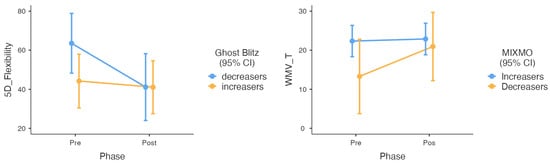 In the next step, we reanalyzed the effects of the intervention by adding the group of players as a factor to the mixed models. We wanted to know whether the impact of the cognitive intervention was different among the different groups of players according to their execution across the other times they played the games. As seen in Table S4 (see Supplementary Material), we only found significant moderating effects on the group that played Ghost Blitz and Mixmo. In Ghost Blitz, the main benefits in cognitive flexibility were found for the players who slightly decreased the points earned play after play (F = 4.721, p = 0.036). Similarly, Mixmo’s main benefits in visuospatial working memory were found in the group of players that slightly decreased the points earned across the plays. As shown in Figure 4, the group of decreares showed lower levels of flexibility and visuospatial updating at baseline.