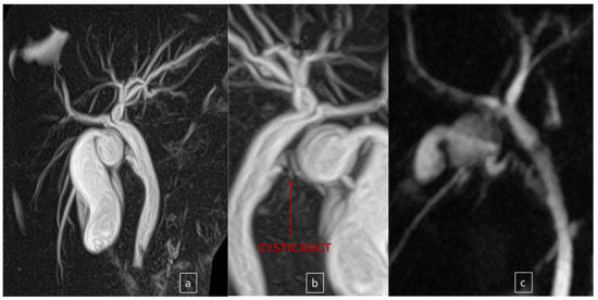 The retrospective analysis was conducted by consulting the medical records. The diagnosis of cholelithiasis was made through the analysis of anamnestic and clinical data, laboratory exams, and radiological imaging: ultrasound (US) and cholangiopancreatography-MRI (cMRI). cMRI was performed with a GE 1.5 T Voyager machine with Dotarem (gadoteric acid) as a contrast medium. COR T2 TSE; AX T2 TSE; AX T1 GE were analyzed as morphological sequences and radial T2 TSE; MRCP 3D as cholangiography sequences.