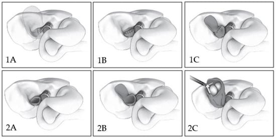 Laparoscopic subtotal cholecystectomy (LSC) classification scheme. Type 1A: normal laparoscopic cholecystectomy. Type 1B: the back wall of the gallbladder (GB) is fully dissected off the liver bed and Hartmann’s pouch is closed following evacuation of gallstones. Type 1C: the back wall of the GB is left in situ and Hartmann’s pouch is closed. Type 2A: the back wall of the GB is excised but Hartmann’s pouch is left open. Type 2B LSC: the back wall of the GB is left in situ and Hartmann’s pouch is left open. Type 2C LSC: the fundus of the GB is deroofed, the stones are evacuated and the GB remnant is left open. These illustrations were created by the Toronto Video Atlas of Surgery (www.tvasurg.ca (accessed on 5 September 2023)) [].