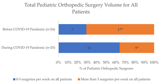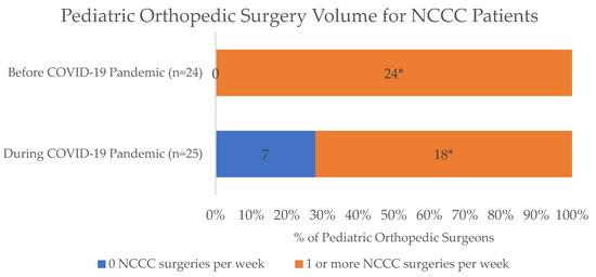 - Gibbard, M.; Ponton, E.; Sidhu, B.V.; Farrell, S.; Bone, J.N.; Wu, L.A.; Schaeffer, E.; Cooper, A.; Aroojis, A.; Mulpuri, K. Survey of the impact of COVID-19 on pediatric orthopaedic surgeons globally. J. Pediatr. Orthop. 2021, 41, E692–E697. [Google Scholar] [CrossRef]