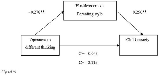 The mediating effect of hostile/coercive parenting style of the association between parental openness to different ways of thinking and child anxiety.