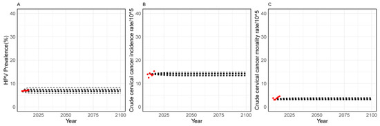 Conditions versus model output after calibration. (A–C) represent the following variables: HPV prevalence (%), Crude cervical cancer incidence rate (/105), Crude cervical cancer mortality rate (/105); Red dot represents observed local epidemiological values, black dot indicates predicted values from the model.