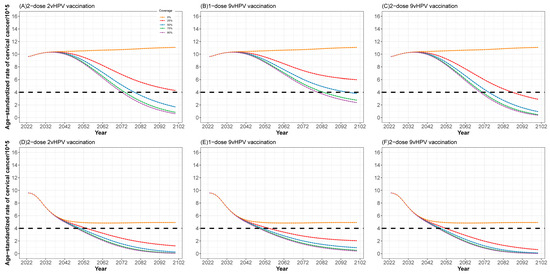 Projection of age-standardized incidence of cervical cancer with different strategies between 2023 and 2100. (A–C) at the current screening rate; (D–F) in the context of expanding cervical cancer screening.