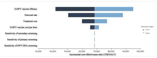 Tornado diagram for two-dose 2vHPV vaccination versus two-dose 9vHPV vaccination ICER in the context of expanding cervical cancer screening.