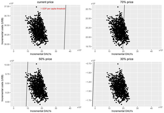 Two-dimensional cost-effectiveness plane demonstrating the distribution of 1000 simulations: two-dose 2vHPV vaccination versus two-dose 9vHPV vaccination in the context of expanding cervical cancer screening at different (100%, 70%, 50%, 30%) price level.