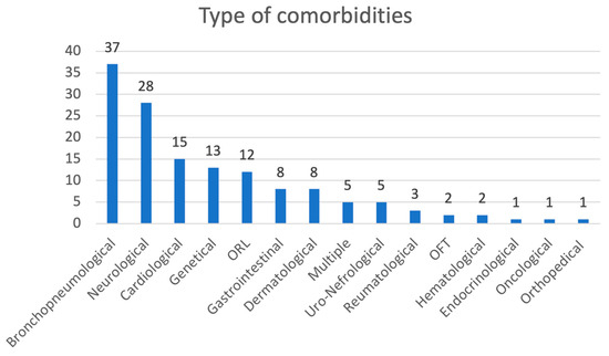 The medical records of 1224 patients (47.7% females) were collected. A total of 246 patients (19.8%) were vaccinated and 143 (11.5%) presented with comorbidities. During the acute infection, 175 patients (14.1%) presented with GI symptoms; in Table 1 details of the study population are reported, while Figure 1 represents the comorbidities of the study population. The percentage of GI symptoms’ persistence in the different follow-up was very low (range 0–4.34%) with a progressive reduction over time, although a very small number of patients (only three) had a 2 years follow-up. Children who needed lactoferrin at follow-up had a higher probability of already experiencing GI symptoms during the acute phase of the infection (p = 0.008).