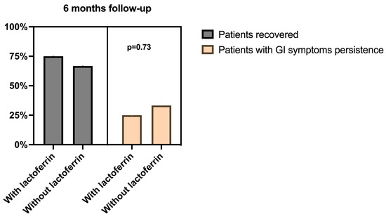 Considering only the patients who presented GI symptoms at the three month follow-up (n = 54), although the cohort patients in the lactoferrin group had a lower percentage of GI symptoms’ persistence at the six month follow-up (3/12 patients, 25%) as compared to those patients not treated (14/42 patients, 33.3%), this association was not statistically significant (p = 0.73) (Figure 2).