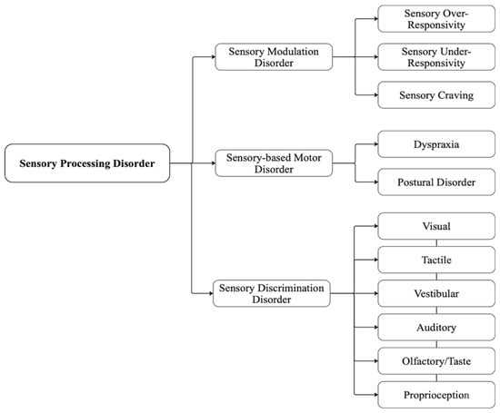 Sensory modulation disorder, sensory-based motor disorder, and sensory discrimination disorder are the three subtypes of SPD (Figure 2). When a child reacts inappropriately to stimuli, they may overreact, underreact, or have sensory cravings []. These three types of responses make up the subtype of sensory modulation disorder. A child struggling with this condition could have trouble controlling their reactions to sensory information []. Dyspraxia, which impairs motor movements, and postural disorder, which affects equilibrium and bodily stability, are the two kinds of sensory-based motor disorder. Lastly, sensory discrimination disorder impairs the ability to determine between the input’s intensity and origin. All of the senses—visual, auditory, tactile, olfactory, taste, vestibular (balance and spatial orientation), and proprioceptive (body awareness)—are affected by this condition. Since SPD is a broad phenotype, the manifestation will vary greatly across individual children. The interventions for SPDs are tailored to the child’s specific needs and may differ across settings in the child’s life [].