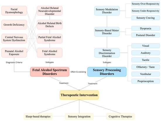 Clinical intervention for SPD is in part determined by symptom severity, which can be managed by a variety of interventions. Interventions to assist children with FASD, SPD, or both, emphasize non-pharmaceutical interventions such as sensory integration, counseling (for both child and family), hands-on activities, sleep-based therapies, introduction of structure and routines, and cognitive control therapies. Pharmaceutical interventions are also often required. These pharmaceutical interventions often target a wide range of co-occurring disorders but may not be unique to FASD or SPDs specifically [,]. Since SPDs are commonly comorbid with FASDs, early recognition, diagnosis, and referral for SPDs is an important aspect of the care for children and families with FASD. The implementation of early intervention measures aims to enhance outcomes, including the advancement of activities replicating daily living skills and the mitigation of potential secondary conditions such as academic underachievement, deficiencies in social skills, and overall performance in various age-appropriate environments. Management and interventions can be applied in diverse settings including homes, schools, and the community [].