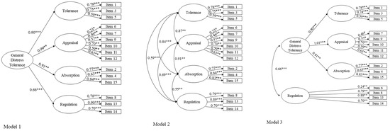 Specifically, in a community sample of 5423 Chinese adolescents aged between 12 and 19 years, You and Leung [38] confirmed the original four-factor structure (although Item 6 was moved from the appraisal to the regulation subscale). Nonetheless, contrary to previous studies with adult samples, the authors postulated that only three of the four first-order factors comprised the general distress tolerance factor: tolerance, appraisal and absorption [38]. The four subscales presented good internal consistency, with Cronbach’s alpha values above 0.70. The authors also examined sex differences in distress tolerance levels, and found that Chinese adolescent girls showed lower levels of distress tolerance and therefore were more likely to make immediate efforts to relieve distress than their male counterparts.