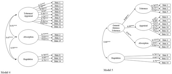 The two models with the best fit (Model 3 and Model 5) were both composed of a general factor of distress tolerance (which includes the sub-scales of tolerance, appraisal, and absorption) and a general factor of regulation. This means that, according to these models, in the sample of the present study, regulation was not considered part of distress tolerance as a general factor, even though they are significantly and positively correlated with each other (i.e., the greater the ability to tolerate one’s emotions, the greater the ability to regulate them and to not make any effort to rid oneself of them). Therefore, distress tolerance as a general factor appears to be more related to more cognitive dimensions and perceived emotional ability (i.e., the ability to tolerate one’s emotions; how a child appraises their negative emotions and their ability to tolerate them; and how the child feels consumed or absorbed by their negative emotions). On the other hand, the efforts that a child makes to rid themselves of their negative emotions (regulation scale—more related to adopted behaviors), although closely related to the construct of distress tolerance, seems to be better understood as a separate general factor. Therefore, these results seem to have theoretical implications for the understanding of distress tolerance in children aged 6 to 12 years old.