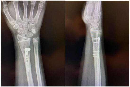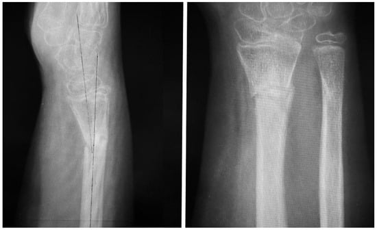 - De Raet, J.; Kemnitz, S.; Verhaven, E. Nonunion of a Pediatric Distal Radial Metaphyseal Fracture Following Open Reduction and Internal Fixation: A Case Report and Review of the Literature. Eur. J. Trauma Emerg. Surg. 2008, 34, 173–176. [Google Scholar] [CrossRef]