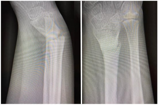 - Sivashanmugam, R.; Vijay, S.; Balakumar, B. Nonunion in a distal radius metaphyseal fracture in a child: Role of intact periosteal sleeve in management. Indian J. Orthop. 2015, 49, 109–113. [Google Scholar] [CrossRef] [PubMed]