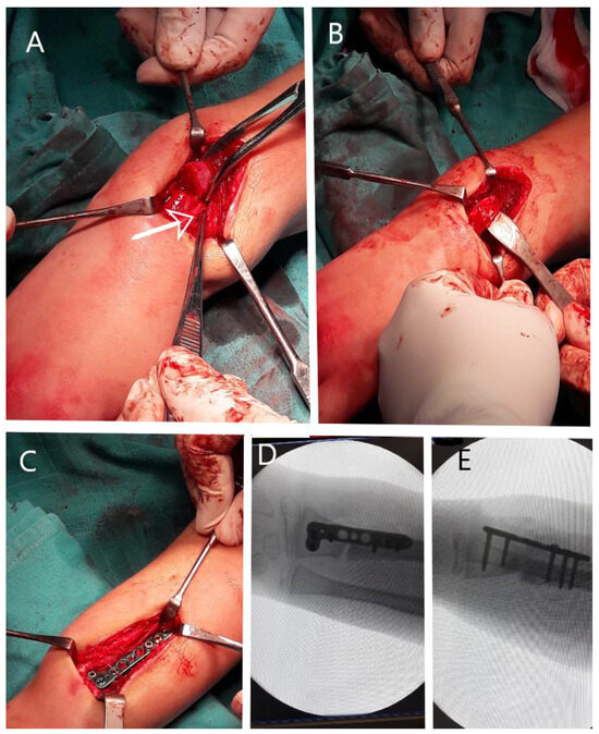 Intra-operative images: (A) intra-operative aspect with arrow pointing at the extensor carpi radialis longus tendon malpositioned on the volar side of the fracture site, in a spiral fashion around the proximal radius; (B) tendon of the extensor carpi radialis longus muscle reduced by passing the tendon through the fracture site to the dorsal side of the radius; (C) intra-operative aspect of the final fixation with locking plate placed on the dorsal aspect of the radius, proximal to the growth plate; (D) intra-operative fluoroscopy AP image demonstrating satisfactory reduction of the fracture and final fixation; and (E) fluoroscopy image in lateral view demonstrating adequate reduction and fixation as well as screw length.