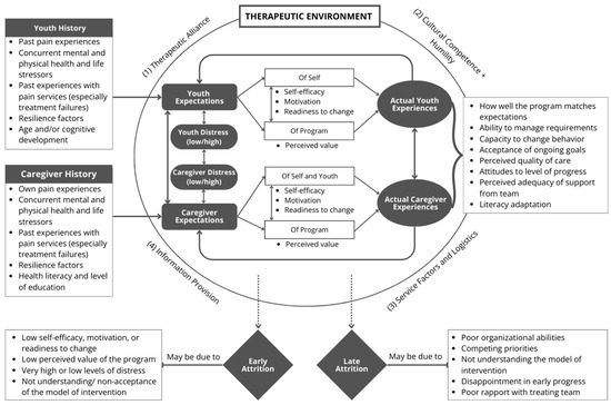 (1) The therapeutic alliance or rapport established between health professionals and patients/caregivers is well recognized as important in the psychotherapy context [3,68,69,70]. In various adult healthcare contexts, the patient–therapist relationship has been shown to impact treatment outcomes [71], with mixed results in the context of adult chronic pain [72]. A discussion of possible mechanisms by which therapeutic alliance drives therapeutic change has been outlined recently [68], and is beyond the scope of the current review paper. A positive patient–therapist relationship may help to motivate and engage patients with the treatment components, resulting in a lower likelihood of attrition. Moreover, a good rapport between the therapist and youth/caregiver enables the therapist to clarify and impress the rationale for the proposed intervention, minimizing any negative preconceptions [29]. Further, therapists who have a good rapport with the family are in a better position to be able to explore the patient’s and caregiver’s beliefs about the pain condition and the proposed management approach to prevent expectation mismatch [73,74]. Doing so may minimize dissatisfaction and potentially reduce the risk of attrition.