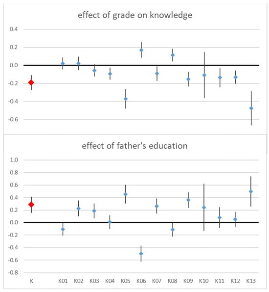 The knowledge score was affected by grade and by the father’s education. Interestingly, the higher the grade, the poorer the overall knowledge (coefficient = −0.19, p < 0.001). The father’s education was a little more predictive (t = 4.33) than the mother’s education (t = 3.7), and overall knowledge increased with the parents’ educational achievement (father’s: coefficient = 0.28, p < 0.001). When both parents’ education was included in the model, only the father’s education remained significant. Not all knowledge questions contributed equally to this result (Table 3, Figure 2).