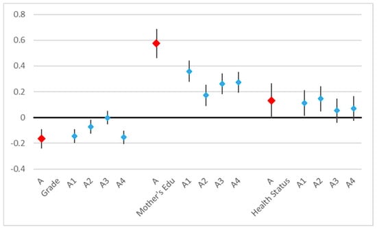 The attitudes score was affected by the grade, the mother’s education, and the health status. Again, the higher the grade, the poorer the overall attitude (coefficient = −0.17, p < 0.001). The mother’s education was a little more predictive (t = 9.92) than the father’s education (t = 8.27), and the overall attitude increased with the parents’ educational achievement (mother’s: coefficient = 0.57, p < 0.001). Only the mother’s education remained significant when both educations were included in the model. A better health status predicted better attitudes (coefficient = 0.13, p = 0.05). All attitudes questions contributed similarly to this result (Table 4, Figure 3). Among specific diseases, only reported lung disease (coefficient = −0.64) contributed significantly (p = 0.037) and negatively to overall attitudes.