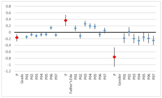 The perception score was affected by grade and gender and by the father’s education. Here also, the higher the grade, the poorer the overall perception (coefficient = −0.09, p = 0.053). The mother’s education was less predictive (t = 2.15) than the father’s education (t = 4.09) and was no longer significant when both variables were included. Males had a lower perception overall (coefficient = −0.28, p = 0.019). Not all perception questions contributed equally to this result (Table 5, Figure 4).