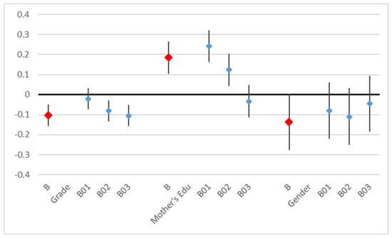 The behavior score was affected by the grade and by the mother’s education. The higher the grade, the poorer the overall good behavior (coefficient = −0.1, p < 0.001). The mother’s education was a little more predictive (t = 5.92) than the father’s education (t = 4.5) and was no longer significant when both variables were included; the overall good behavior increased with the parents’ educational achievement. Not all behavior questions contributed equally to this result (Table 6, Figure 5).