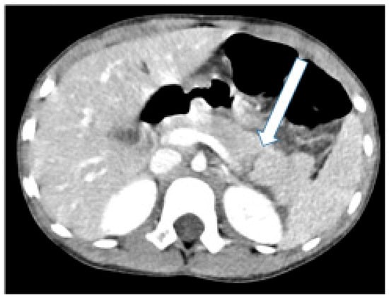 During the last decade, contrast-enhanced ultrasound (CEUS) has been considered an appealing alternative to contrast-enhanced CT in the evaluation of children with blunt abdominal trauma, mainly with respect to the potential reduction in the use of ionizing radiation and contrast media []. Pancreatic lacerations and fractures appear on CEUS as non-enhancing or hypoenhancing defects in both the arterial and venous phases of enhancement, and are frequently seen to involve the pancreatic capsule []. However, CEUS has some limitations, particularly in the assessment of small pancreatic lesions, in the evaluation of mild ductal disruptions, and in the detection of vascular complications. In a recent comparative study, Miele et al. compared the usefulness and the feasibility of MRI and CEUS in the follow-up of patients with low-grade blunt abdominal trauma. Those authors showed that MRI enabled a better assessment of injuries than CEUS while also allowing the determination of the temporal stage of the lesions [].