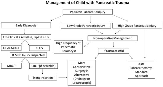 Blunt trauma represents the primary cause of pancreatic injury in the pediatric population. Pancreatic trauma in children remains a major challenge for emergency physicians as well as general and pediatric surgeons. Its rate of occurrence is 0.2–2%, and it contributes to 0.3% of all childhood injuries [,,]. The mortality rate associated with BPI remains low, ranging between 4.7–5.3%, with most fatalities linked to concurrent injuries. While there are established protocols for diagnosing and surgically managing pancreatic injuries in adults, the approaches to handling high-grade BPI involving the major pancreatic duct in children remain a subject of debate. In 2022, The Western Trauma Association (WTA) published clinical practice guidelines on pancreatic trauma in the adult population []. The WTA evaluation and management algorithm applies to the diagnosis and management of adult patients with BPI. Since delayed diagnoses can result in increased morbidity and mortality of up to 62% of patients [], the WTA Committee recommends early performance of CT as part of the initial trauma workup. Imaging findings of transection of the pancreas, disruption of the MPD, or of a large amount of peripancreatic fluid mandate operative exploration. When imaging findings are not sufficiently clear-cut, other investigations may be useful, and they include serial abdominal examinations, serum amylase and lipase enzyme levels, MRCP, endoscopic retrograde cholangiopancreatography (ERCP), and transduodenal pancreatography. The major determinant in management decisions in adults with BPI is the presence or absence of injury to the main pancreatic duct (MPD). Since low-grade pancreatic trauma (Grades I and II) are contusions and lacerations that spare the pancreatic duct, they are mostly managed conservatively. In adult patients with low-grade injuries who have indications for laparotomy, drain placement to control the leakage is recommended only if there is pancreatic capsule disruption. In accord with the WTA algorithm, most adults with “high-grade” pancreatic injuries (Grades III = MPD injury to the left of the superior mesenteric vein [SMV], Grade IV = MPD injuries to the right of the SMV, and Grade V = involving disruption of the head of the pancreas) require definitive surgical treatment to avoid duct-related complications that carry a morbidity of up to 60% [].