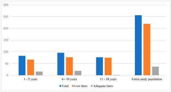 Overall, 37 children (14.4%) were categorized as having adequate vaccine-induced anti-HBs antibody levels (>10 IU/mL), while 219 (85.6%) had sub-optimal titers of <10 IU/mL (Figure 1). Nearly all (97.4%) of the sub-group aged 10 years and above had low seroprotection, with adolescents (11–18 years) being ten-fold more likely to have low anti-HBs antibody levels than those aged less than 5 years. Subjects with low titers were advised on receiving booster vaccinations and repeat serologies.