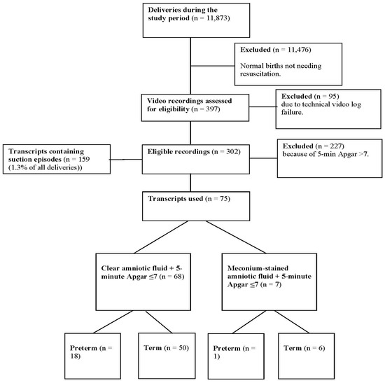 Participants included in the systematic ILCOR review were predominantly healthy term newborn infants. There is a scarcity of data on depressed infants of different gestational ages (GA) with regard to the potential harmful effects of airway suctioning. In this observational study using transcribed video-recorded neonatal resuscitations, we hypothesised that, in moderately to severely depressed infants, suctioning of CLAF or MSAF negatively affects spontaneous breathing and heart rate (HR) in preterm and term infants, with subsequent need for prolonged resuscitation. Furthermore, we hypothesized that term infants that receive ASU are being admitted to the NICU more frequently than expected, i.e., not due to low birth weight and other predetermined admission criteria. By testing these hypotheses, we hope to contribute to filling the knowledge gaps in our understanding of how delivery room ASU may clinically affect different subgroups of depressed infants.