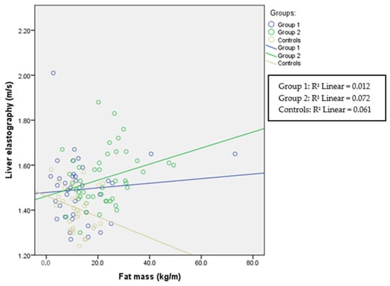 Liver elastography and fat mass in all three groups. Spearman’s correlation coefficient for Group 1 is r = 0.004 (p = 0.980), for Group 2 r = 0.273 (p = 0.066), and for the control group r = −0.250 (p = 0.176).