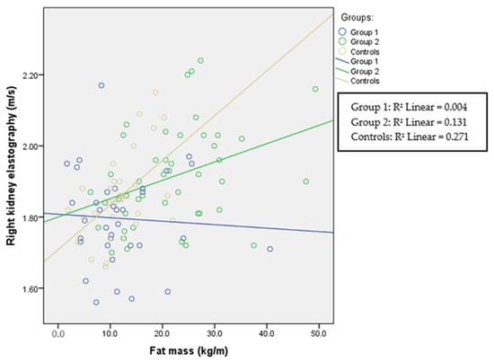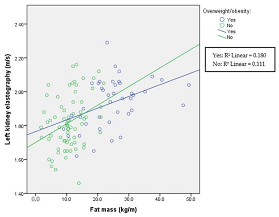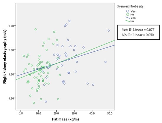 Renal cortical stiffness was significantly higher in the overweight/obese group; however, in all groups in this study, fat mass correlated with left and right kidney elasticity (Figure 5 and Figure 6), demonstrating that, even in the normal-weight participants, the amount of fat mass is associated with kidney tissue elasticity.