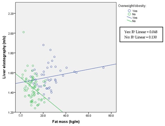 Liver elastography and fat mass according to overweight/obesity status. Spearman’s correlation coefficient for overweight participants is r = 0.234 (p = 0.130) and for normal-weight r = −0.306 (p = 0.009).