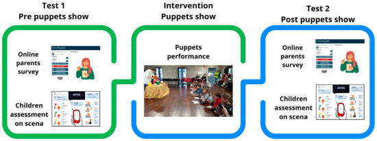 The puppet show was scheduled to last 30 min and was consistently performed by the same actress and characters, as well as under optimal conditions of light, sound, and space. The research design focused on two aspects: (a) the pre- and post-intervention knowledge of the children and (b) the attitudes and knowledge regarding drowning prevention among the parents (Figure 2).