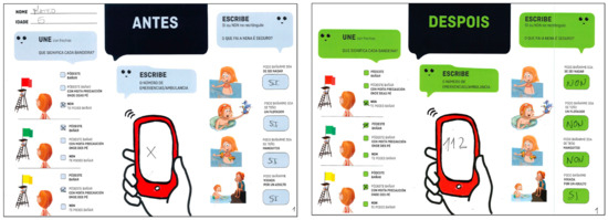 The evaluation tool was designed in the format of a children’s school card, wherein children were required to answer a series of questions presented in the form of illustrations (Figure 3). This evaluation system was employed based on a previous pilot study that demonstrated its methodological feasibility for similar age groups [10]. The design and iconography of the evaluation sheet were developed by two professionals in graphic design and arts, with extensive experience in the illustration and creation of children’s materials.