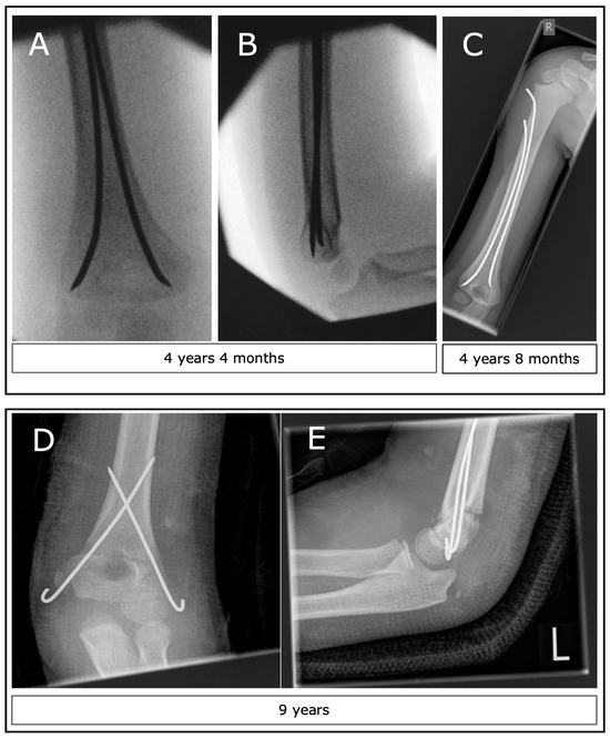 - Lindsay, S.E.; Crawford, L.; Holmes, S.; Kadado, A.A.; Memon, R.; Souder, C.D.; Swarup, I.; Halsey, M. Return to the Operating Room for Unplanned Pin Removal After Percutaneous Pinning of Supracondylar Humerus Fractures: A Retrospective Review. J. Pediatr. Orthop. 2023, 43, e508–e512. [Google Scholar] [CrossRef] [PubMed]