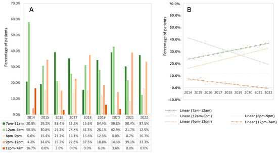 Time of the day on which the operations were performed. (A) The bars show the percentage of patients who underwent surgery at the highlighted time point. (B) The dotted lines show the corresponding linear regression of the percentages at each time point.