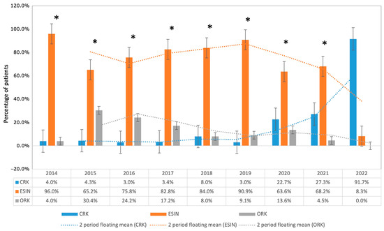 Percentage of patients who underwent surgery using different methods is shown. The data reflect a transition from ESIN to CRK, starting in 2020 and peaking in 2022. The error bars indicate ± standard error of the mean (±SEM), and the dashed lines represent the moving averages over two periods. * indicates a significant difference in the percentage of patients undergoing CRK or ESIN compared with 2022 (p ≤ 0.001).