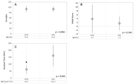 Results of questionnaires. (A) shows the results of EuroQoL and (B) the results of DASH scores of patients operated either via ESIN or ORK. Depicted are the mean scores ± standard deviation (StDev). (C) shows the mean operative time ± StDev for both procedures for the analyzed patients (n = 27 for ESIN and n = 21 for ORK). * p-values of t-tests < 0.05 were regarded as statistically significant.