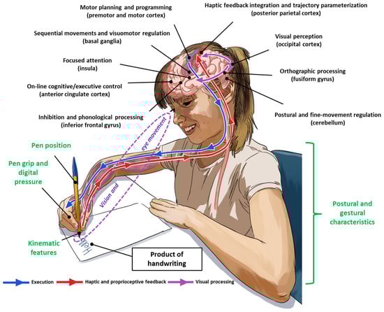 Handwriting is a complex skill involving activations in the left dorsal premotor cortex, the inferior parietal cortex, the fusiform gyrus, the bilateral inferior frontal gyrus, the right cerebellum and the primary motor cortex, which is devoted to manual motor output. In the basal ganglia, the striatum mediates visual–motor integration []. Children, unlike adults, recruit in addition the prefrontal cortex, notably the anterior cingular cortex, to perform writing tasks, which is interpreted as a mark of a lower-level automation between the ages of 8 and 11 [,]. Handwriting also involves gestural and kinematic characteristics (i.e., the handwriting process in green in the text) leading to the production of the written trace (i.e., the product of handwriting).
