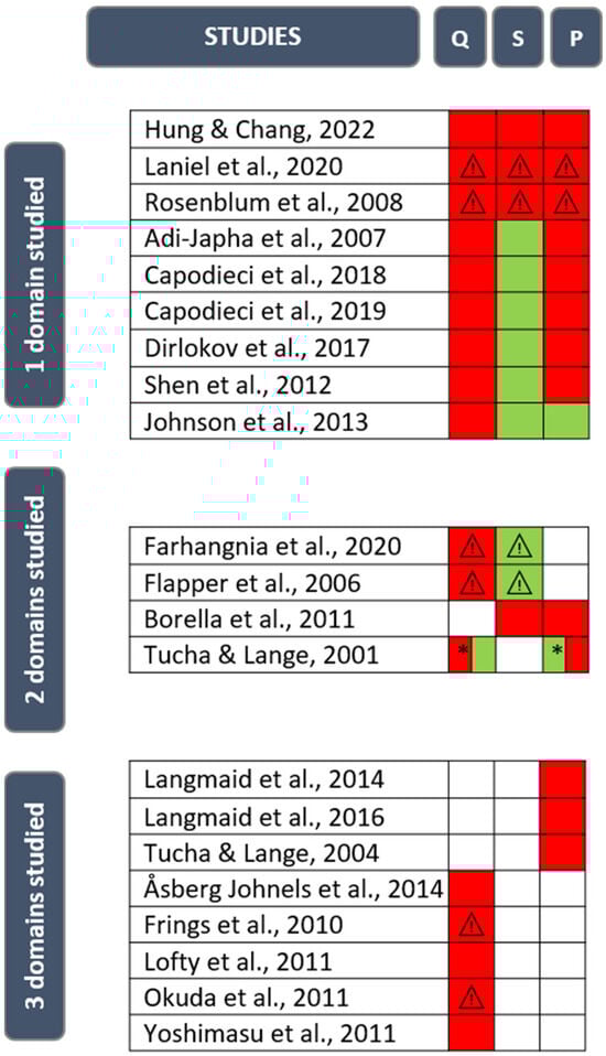 Rapid overview of results of included studies. Abbreviations: Q: quality (product); S: speed (product); P: process; green: non-impaired; red: impaired; ⚠:methodological biases identified; *: without MPH [,,,,,,,,,,,,,,,,,,,,].