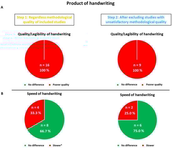 Pie charts for both Step 1 and Step 2 analyses of the product of handwriting. The proportion of studies showing differences between ADHD and typically developing children regarding quality/legibility (Panel (A)) and speed (Panel (B)) of handwriting before (Step 1) and after (Step 2) the exclusion of unsatisfactory studies due to major methodological biases. *: except for Rosenblum et al.’s study [], which showed faster production in the ADHD sample.
