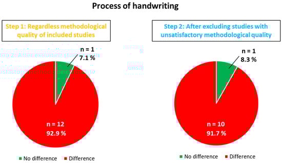 Fourteen studies out of twenty-one examined the handwriting process [,,,,,,,,,,,,]. There were various targeted variables: working memory load, strokes duration, ballisticity, in-air time and pen pressure. Only one study [] reported the absence of difference (considering the coefficient of variability in phrase height and width). Tucha and Lange [] found that methylphenidate use led to the handwriting process’s deterioration, but following withdrawal, the results of the ADHD children did not differ from that of the control groups. Before exclusion (Step 1), 13 out of 14 studies (92.9%) indicated variations between the ADHD children and the control groups. This score remained at 91.7% after Step 2, with the exclusion of studies by Laniel et al. [] and Rosenblum et al. [], for the same reasons as mentioned previously (Figure 3). Authors have highlighted that ADHD children demonstrated increased pen pressure [], greater variability in acceleration–deceleration phases [] and in stroke length [], or more inversions in the direction of their velocity profiles, thereby indicating a lack of automation [] when compared to the control groups.