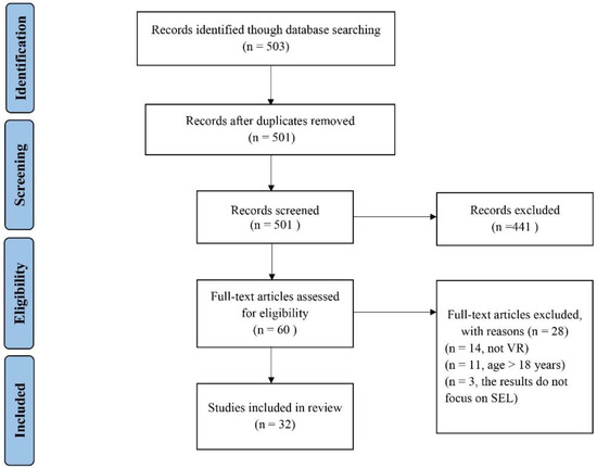 A literature search was conducted according to the standard systematic literature review process. Articles were retrieved from the core collection of the Web of Science online database to ensure the quality of the article. Articles were limited to those written in English and published between January 2013 and May 2023. We chose the year 2013 as the start of our literature search since it witnessed the release of Oculus Rift DK1, which marked the successful commercialization of VR devices featured by advanced functions and low cost. The devices provide people with more opportunities to experience VR. They also enable developers to create VR applications with greater ease and more diversity. As a result, we decided to start literature search in 2013. The following search terms were used: (a) “virtual reality” or “VR” or “virtual” or “Immersive Virtual Environment” or “Immersive Technolog*” or “3D Environment” or “cave” (because cave environments are not clearly classified by level of immersion, some articles use the term “cave” in their titles instead of “VR”); (b) “social emotional learning” or “social emotional competence” or “social emotional development” or “social emotional skill*” or “social skill*”; and (c) “child*” or “youth” or “young people” or “teenager” or “adolescent”. Using these search criteria, a total of 503 articles were retrieved.