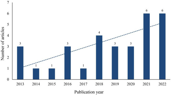 Based on the collected article metadata, 32 articles were analyzed in total. As shown in Figure 2, from 2013 to 2022 (note that 2023 is not included because data for the full year were not available), the number of published articles followed an overall upward trend. One possible reason that the number of studies peaked in 2021 is that the COVID-19 pandemic caused more students to have social and emotional problems [36]. Of the 32 articles, 5 were conference papers, 3 of which were from IEEE Transactions on Neural and Rehabilitation Engineering, accounting for 60% of conference papers. There were 27 journal papers, of which the highest ranked source was Computers and Education, with 3 papers. Among the 25 studies that reported the location of the experiments, the United States ranked first, accounting for 48% (n = 12) and China ranked second (n = 5, including one each in Hong Kong and Taiwan).
