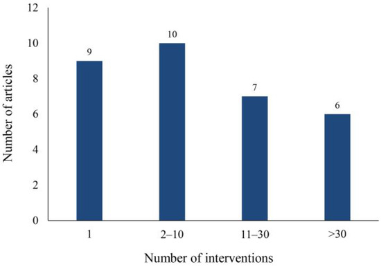 As shown in Figure 4, nine studies administered only one intervention. Ten studies contained 2–10 interventions, and there were six studies with more than 30 interventions. The shortest intervention duration was 15 min and the longest was more than 60 h. During the 15 min intervention, children exercised their social skills using an HMD to enter a virtual store, identify items on the shelves, and look at the owner who helped them make purchases. The study did not quantify children’s learning outcomes but focused on children’s experiences in VR [40]. The longest intervention lasted for three months and consisted of 90 45-min sessions. This study divided participants into three groups, VR, VR and medication, and control, and was the only study that used medication [45]. Most of the studies (72%) involved two or more interventions, possibly because a single intervention is rarely effective for a child with a disorder.