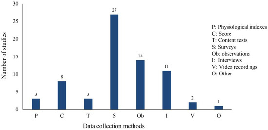 The included studies used seven ways to collect data: physiological indexes, such as eye movement, pulse volume map, and skin temperature signals; scores in VR games or scene missions; content tests, including card, emotion recognition, and question tests; surveys, in which data were collected using questionnaires; observations, when participants’ reactions were recorded by the researcher or their parents’ observations; interviews of students, parents, or teachers; video recordings of the intervention process; and others, such as the use of the Avatar protocol to collect student development information. Each study used one or more of these methods to collect data. As shown in Figure 5, the most commonly used data collection method was the questionnaire survey (n = 27). It is worth noting that three studies collected physiological indicators [20,47,48], and collecting considerable physiological data in combination with other subjective data such as questionnaires or observations can better reflect the real state of the participants.