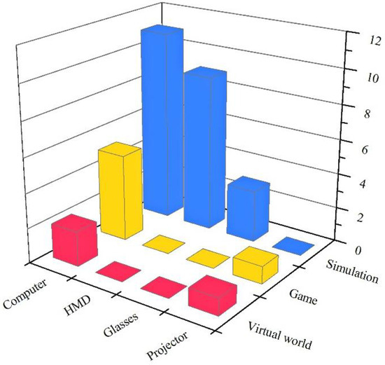 As shown in Figure 6, the most extensively researched method involved the simulation of scenarios through computing equipment. The second method employed HMD for interactive engagement with simulated environments. The third method employed computers to develop social and emotional competence in the form of games. From an equipment standpoint, the contrast between children using computers and HMD for learning experiences in the simulated environment was primarily based on immersion and operational methods, as previously noted. Considering the technology type, children have different goals and tasks when using computer equipment to participate in virtual scenes and play games. The simulations aimed to recreate the real world and allow students practice of social skills, such as greeting people and expressing their opinions [52]. By contrast, games were more entertaining and helped students cooperate with others and regulate their emotions in the context of storylines and motivational points [53,54]. The use of virtual worlds and game-type VR also tended to exclude HMD and glasses equipment, as shown in Figure 6, which indicates the current limitations of semi-immersive environments. Virtual worlds enhance interaction while games garner greater interest from children, potentially yielding improved outcomes when utilized with fully immersive VR technologies.