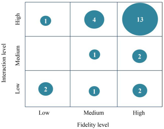 The fidelity level was judged according to the degree to which reality was simulated. Based on the pictures provided in the text and the author’s description, those that were highly similar to real life were considered as high level, while those with cartoon or mismatched characters were low level. We also considered high-level interactions that permit users to navigate the environment with autonomy or experience motion [55,56], whereas interactions consisting of predetermined conversations or mere clicks were low-level [57,58]. As shown in Figure 7, the double high level received the most attention, followed by VR combinations with high levels of interaction and medium levels of fidelity. VR that combines high-level interaction and high-level fidelity offers children a more practical and authentic setting for SEL. For example, Sarver and Beidel [39] employed exquisite modeling techniques to depict the school setting, accurately capturing the facial expressions and actions of teachers, classmates, school bullies, and other characters. The VR system also provided three levels of interaction with varying degrees of difficulty, which enabled children to engage in learning activities such as greetings, responding to others’ questions, and initiating conversations as they worked to enhance their social skills. The high-fidelity representation and infinite conversational possibilities of the VR system enabled children to socialize freely within the virtual environment.
