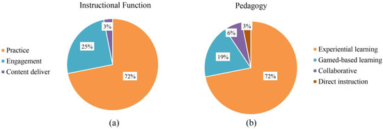Instructional functions in the VR interventions included practice, content delivery, and engagement. As shown in Figure 8a, the most common use of VR was to practice social and emotional skills, followed by encouraging students to be more engaged, and the least used was content delivery. Most participants were students with mental disorders, in that they lacked social and emotional competence; thus, it was reasonable to use VR for a large proportion of practice, because simply using VR to present content may not allow students to learn actionable knowledge. As shown in Figure 8b, there were four categories of pedagogies in the studied interventions, with experiential learning being the most commonly adopted, game-based learning the second most popular, and direct instruction being the least utilized. Experiential learning permits students to personally encounter social situations and learn communication and collaboration skills by interacting with the environment and other characters, in addition to applying to the development of children’s social and emotional competence.