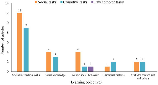 Following Dechsling et al. [59] and Durlak and Weissberg [11], we classified learning objectives into five categories: social interaction skills, including joint attention, communication, and cooperation; social knowledge, consisting of emotion recognition and social understanding; positive social behavior, such as sharing, enjoyment, and anger control; emotional distress, including depression, anxiety, and social phobia; and attitudes toward self and others, including self-esteem, self-efficacy, and sympathy. As shown in Figure 9, social interaction skills accounted for the largest proportion of interventions, which is consistent with the results of Fernández-Sotos et al. [60], followed by social knowledge. The smallest proportion constituted emotional distress and attitudes toward self and others. This result indicated that most research has centered on communication and cooperation in SEL but has paid less attention to self-concept and stress. One possible reason for this is that the explicit behavioral manifestations of children’s lack of social and emotional competence are often related to their difficulties in communicating with others, and the degree of understanding of their own emotions and stressors is more difficult to identify.