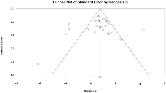 As shown in Figure 10, most of the study effect values were distributed at the top of the funnel plot, and symmetrical distribution on both sides of the center line proved that the possibility of publication bias was small. At the same time, the classic fail-safe N test was 706, which is higher than the 5k (k = 31) + 10 proposed by Rosenthal [64]. In summary, there appeared to be no bias in the meta-analysis, and the results of this study are therefore reliable.