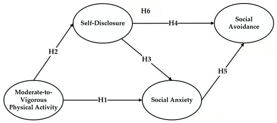Shy children often adopt a sedentary lifestyle as a substitute for physical activity, displaying low social competence and social avoidance behavior, ultimately affecting the physical and mental health of children [54]. Li et al. [55] used mindfulness and social avoidance as mediating variables for physical activity and mental health, confirming a positive correlation between physical activity and mindfulness and mental health. It was negatively correlated with social avoidance and distress, indicating that successful sports events can effectively improve participants’ mental health by enhancing mindfulness levels, reducing social avoidance, and distress. Numerous studies demonstrate the positive effects of physical activity on treating psychological disorders (depression, anxiety, low self-esteem, etc.) and social challenges (avoidance, rumination, withdrawal, etc.). The more physical activity, the greater the therapeutic potential for psychological disorders [56]. Kagawa et al. [57] found that as the physical activity–pleasure index (PA-PI) increased, avoidance/rumination behaviors gradually decreased. Aerobic–anaerobic exercise can improve body composition and shape in obese women, enhance self-image and self-awareness, reduce social avoidance and distress, and achieve the goal of boosting self-esteem, confidence, and social skills [58]. Based on previous research, it can be inferred that there may be a negative correlation between physical activity and social avoidance. However, no scholars have explored the mediating effects. Therefore, this study hypothesizes that social anxiety and self-disclosure act as dual mediators in the relationship between moderate-to-vigorous physical activity and social avoidance.